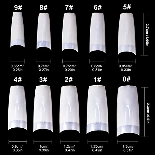 - 【Varied Size】- 500pcs artificial false nails tips has 10 different sizes with 50 nails of each size that fit most fingers. According to the number 0-9 on the box, you can trim and shape your own nail’s length and size easily