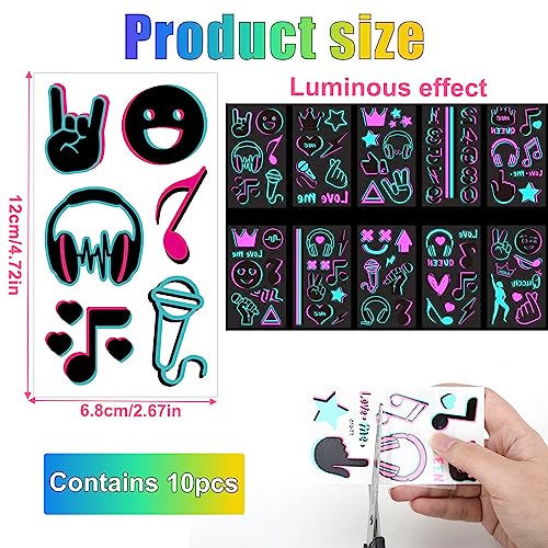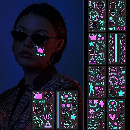 - Variety of Designs: NOTE(Tattoo stickers need to absorb enough light to glow in the dark). Choose from 10 sheets of neon temporary tattoos featuring Smiley faces, hearts, music symbols, headphones, microphones, crowns, various gestures and more. These face tattoos glow under ultraviolet rays, creating stunning fluorescent effects day and night, let you stand out and be the center of attention at any event!