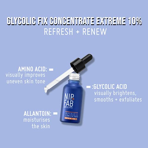 - GLYCOLIC ACID BOOSTER - Nip + Fab Glycolic Fix Extreme Booster is formulated with pure glycolic acid to brighten and exfoliate skin, 10% glycolic acid liquid drops for face