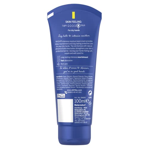 NIVEA Intensive Moisture Hand Cream (100ml), Nourishing Hand Cream with Almond Oil and Shea Butter, Daily Hand Lotion for Women, Moisturiser for NIVEA Intensive Moisture Hand Cream (100ml), Nourishing Hand Cream with Almond Oil and Shea Butter, Daily Hand Lotion for Women, Moisturiser for