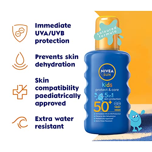 NIVEA SUN Kids Protect & Care Coloured Spray SPF 50+ (200 ml) Sunscreen Spray with SPF 50 Suncream for Kids’ Delicate Skin, Immediately Protects NIVEA SUN Kids Protect & Care Coloured Spray SPF 50+ (200 ml) Sunscreen Spray with SPF 50 Suncream for Kids’ Delicate Skin, Immediately Protects