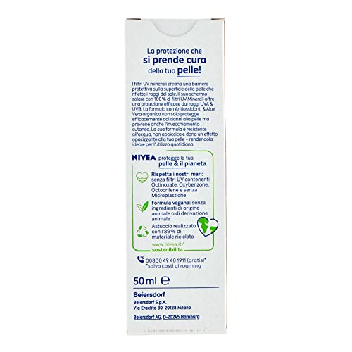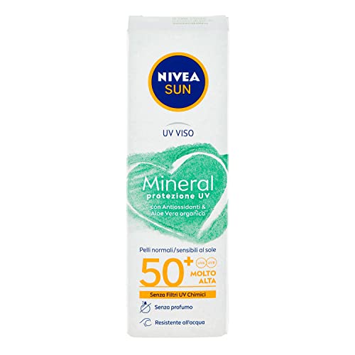 - . Box contents: Nivea Sun UV face cream mineral FP50+, face cream with organic aloe vera and antioxidants, 50+. ml, item number: 85 692