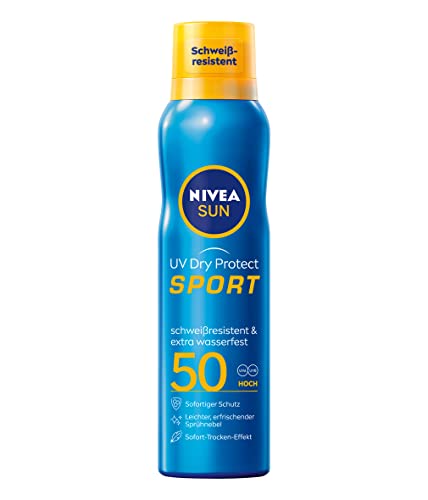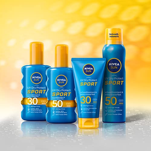 - Box contents & details – Nivea Sun UV Dry Protect Sport Spray Mist SPF 50 (200 ml), sweat-resistant and extra waterproof sun spray, item number 80461