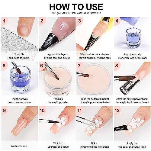 - NO NEED NAIL LAMP CURE - This acrylic false nail powders does no need nail lamp to cure that save your time and this acrylic nail powder only need several steps working with acrylic liquid monomer to do nails extensional and 3D nail art design.