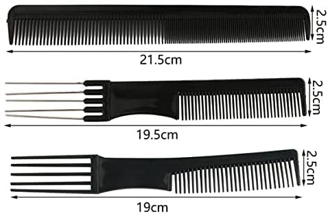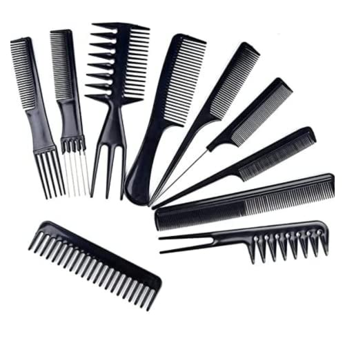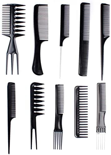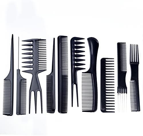 - MATERIAL: The 10Pcs Hairdressing Comb Set is made of Plastic, and Black in colour. Each of the 10 combs has strong teeth to ensure that you can tease, trim, detangle and groom in confidence. There are 10pcs different hair combs for different hair requirements.