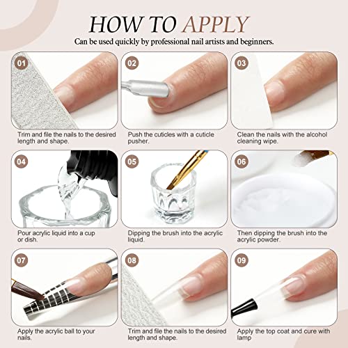 - Easy Application: Use acrylic nail brush apply onto your real nail or nail forms. And it dries in few minutes, slow enough for corrections. (It is recommended to use this product in a ventilated environment to reduce the smell. After every application,clean the acrylic brush or it will be hard to clean because acrylic powder quickly clumps in a short time.)
