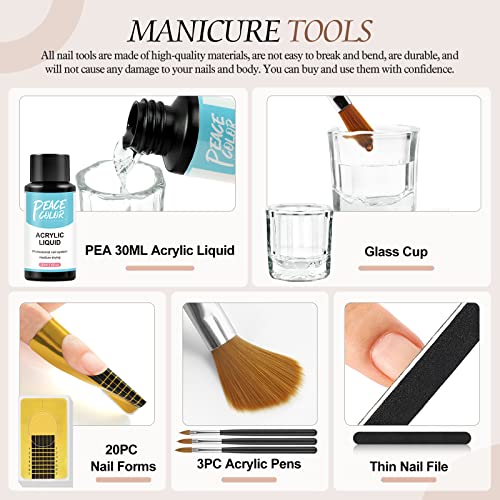 - The Acrylic Powder Kit includes 3* 8g Acrylic Powder(Clear/White/Pink) , 1* 30ML Acrylic Liquid , 20 pieces nail form, 1 acrylic nail brush pen, 1 Golden Foil Paper For Decoration and 1 glass container,choice for salon and home use