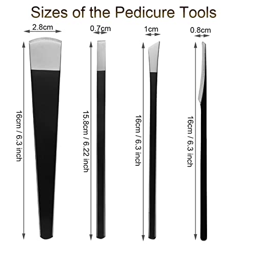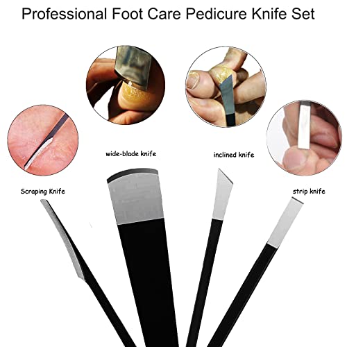 - WIDELY APPLICATION - The professional pedicure knife set effectively removes dead skin, calluses and cuticles. A flat knife can remove calluses, warts, and corns and help trim toenails. Bevel knives remove residual nails at the base of toenails when treating ingrown nails. The scraper removes dead skin and dirt between the feet and between the toes and can also be used to relieve itchy feet. Slicing knife will trim calluses, corns, plantar warts, etc. for clean and healthy feet