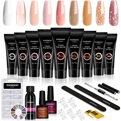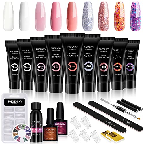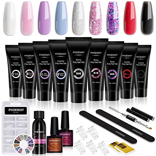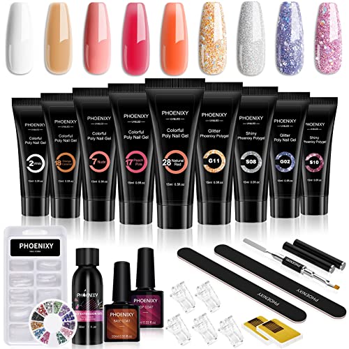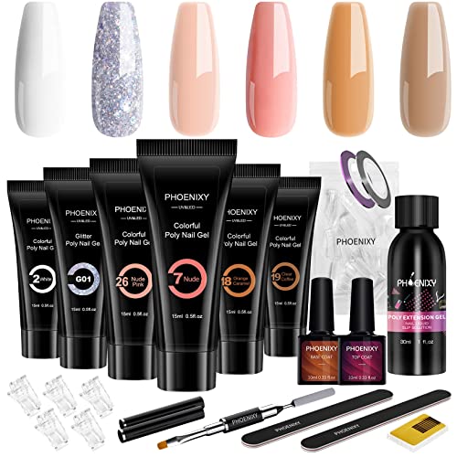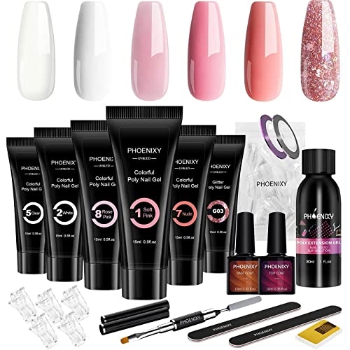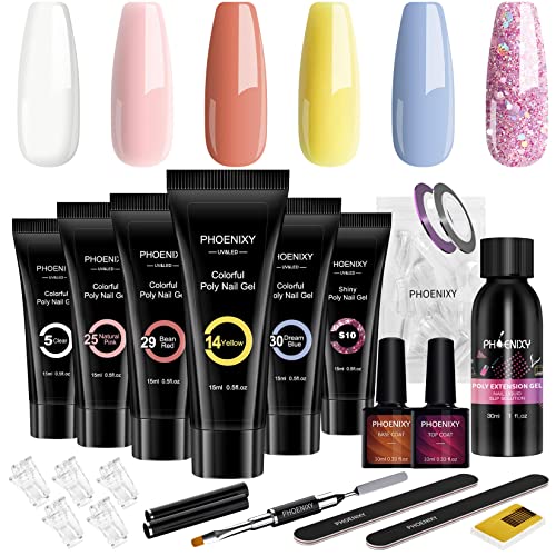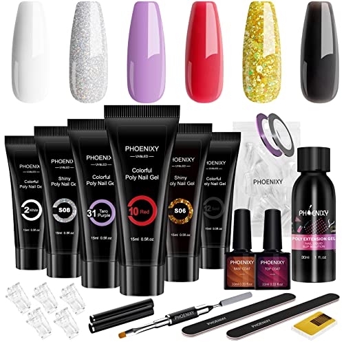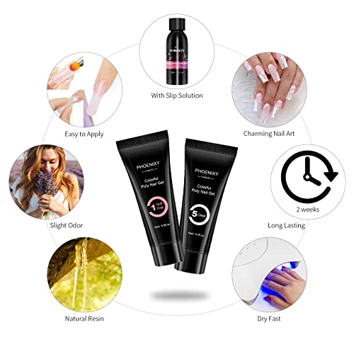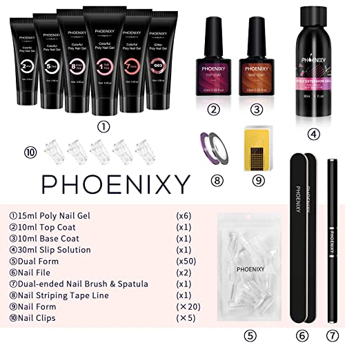 - What You Get - 15ml 6 colours poly nail gel set, 10ml base and top coat, 1x 30ml slip solution , 1x 50pcs poly nail dual forms (10 sizes), 1x dual-ended nail brush and spatula, 2x nail files, 2x nail art wire decoration, 5x poly nail clips. Saving your money and time with phoenixy nail extension gel kit!
