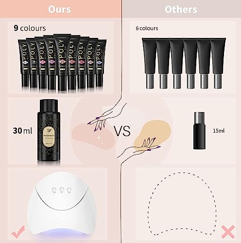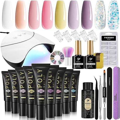 - [Poly Nail Gel Full Set]: Phoenixy gel nail kit comes with everything. 15ml 9 colours colours gel, 36w nail lamp, 30ml slip solution for nail, 10ml no wipe top and base coat, basic manicure tools. You can do any nail decorations, both home manicure and professional salon. It’ s best for beginners and save time & money.