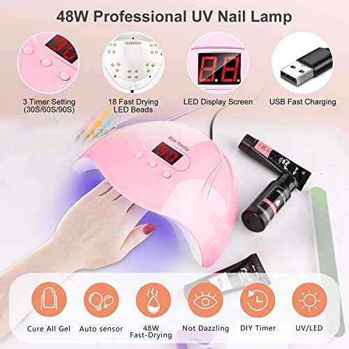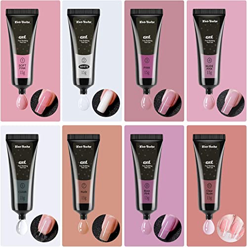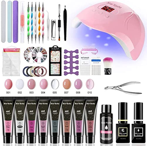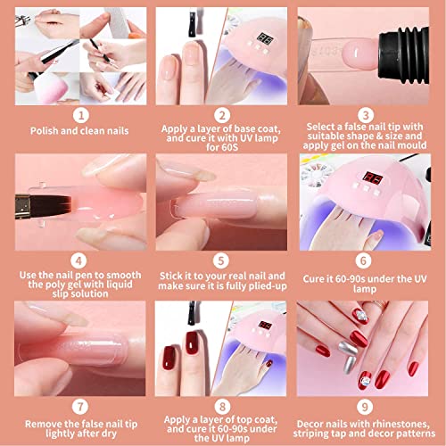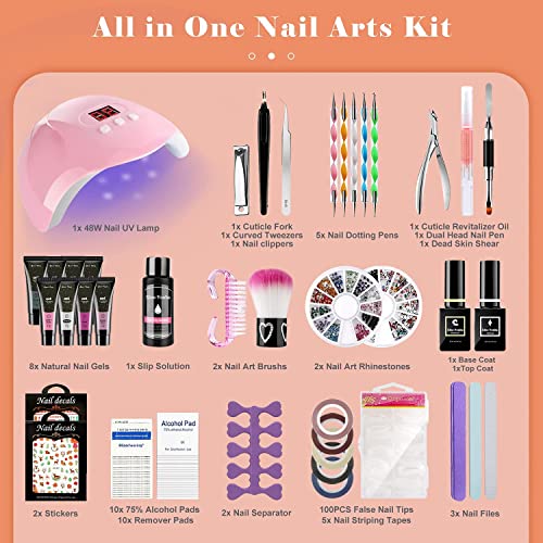 - 🌸🌸【Gel Nail Full Sets for Beginner&Professional Manicurist】You can get 8*15g Poly Builder Gels, 48W Nail UV Lamp, 2* Base&Top Coat, Slip Solution, 20*Clean and Remover Pads, 1*Cuticle Revitalizer Oil, 1*Dual Head Nail Pen, 3*Curved Tools, 5*Nail Dotting Pens, 3*Nail Files, 2*Nail Art Brushs, 9*Nail Decorations, 100PCS False Nail Tips, etc. Save your time and money spent in manicure store, bring this comprehensive set back home and be your own nail designer! Enjoy your nail salon at home!