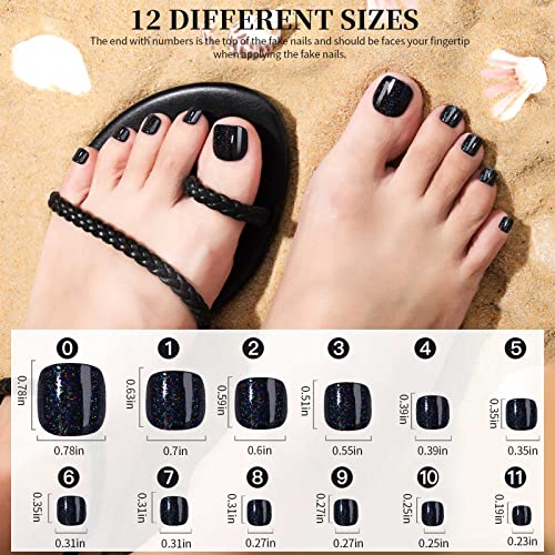 - Short Square Fake Toenail Shape: Designed with short square shape, cute and convenient. Short length will not affect your normal life. Full cover design, fit and good cover the shape of your own toe nails that make your toenail art looks more natural. The press on nails are pre-numbered (0-11) on the tips for easily find. Total 12 different sizes suitable for both big toes and small toes.Fits the size of our toes. You can find the most suitable size for your toes.