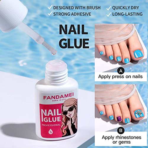 - Premium Nail Glue: The nail tips glue is designed with a applicator brush that is easier to use than the squeeze bottle. 7g nail glue is strong adhesive, quickly dry and long lasting. If you want to keep the press on nails for long time, please select the nail glue. Perfect for sticking artificial nail tips, small nail art decorations such as rhinestone, glitters, flakes. Great for DIY nails. Only 3/5 bottle filled to avoid the glue leaking under high temperature.