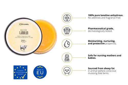 - LANOLIN PURE 100%: This is the highest quality, natural wax extracted from sheep fat, produced in the EU in cooperation with animal welfare conscious mulesing-free farms. Our pure lanolin has a pharmaceutical-grade, contains no preservatives such as BHT or other additives, and is anhydrous and fragrance-free.