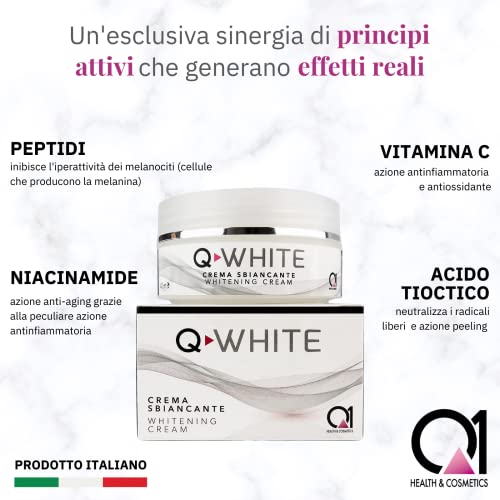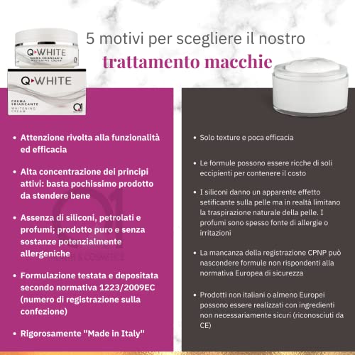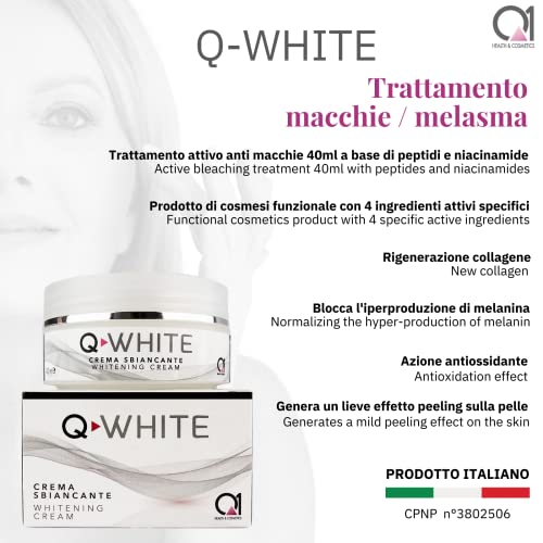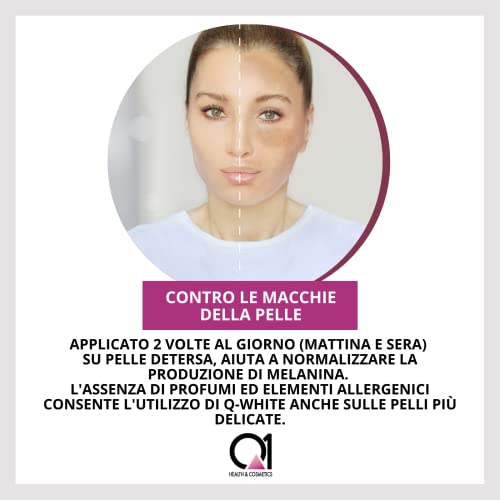 - QUICK AND SIMPLE APPLICATION: The Q-White anti-blemish cream determines an intense bleaching action normalizing the production of melanin. Apply a small amount of product directly twice a day (morning and evening)