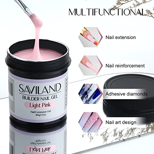 - 🎁 LARGE CAPACITY BUILDER NAIL GEL - Saviland builder nail gel is in a large capacity design, with trendy light pink color. This nail gel builder can be used with nail forms or nail tips for colorful nail extensions. 100g/3.53oz large capacity nail extension gel, you don't need to worry about running out of it in a short time, sufficient for long-term use. Perfect for the professional nail salon or home DIY. A must-have extension gel for extended nail art lovers.