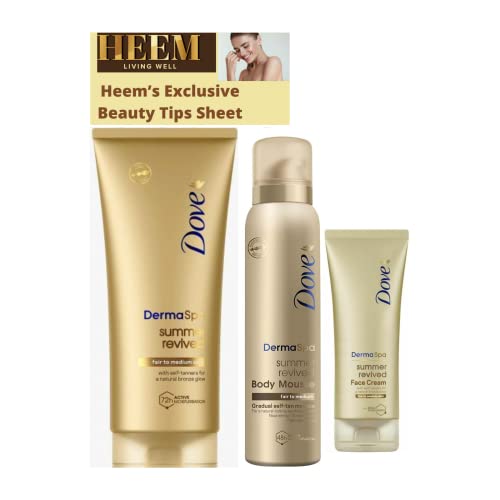 • Bundle Contains Dove DermaSpa Summer Revived Fair to Medium Face Cream 75ml, Body Lotion 200ml, Self-Tan Body Mousse 150ml and Heem’s Exclusive Beauty Sheet <br>