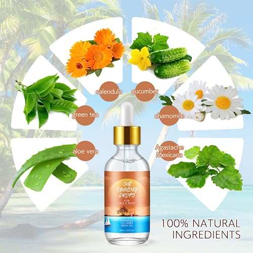 - 【Natural skin care ingredients】This self-tan drops blend of 6 superfoods such as: Aloe Vera, Green Tea, Chamomile, Cucumber, Agastache Mexicana and Calendula nourishes and brightens the skin, leaving it hydrated and brightened and never dry.