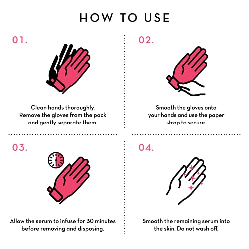 - HOW TO USE Clean hands thoroughly. Remove the gloves from the pack and gently separate them. Smooth the gloves onto your hands and use the paper strap to secure. Allow the serum to infuse for 30 minutes before removing and disposing. Smooth the remaining serum into the skin. Do not wash off.