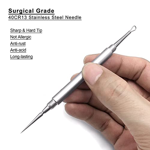 • SURGICAL GRADE 420# STAINLESS STEEL NEEDLE: This pimple lancet is made of surgical-grade 420# stainless steel, easy grip, 5.12inches; Tip of lance stay sharp and firm for longer period, and loop circle will stay sturdy that not easy turned or bended; It is the best tool for facial blemishes popping & extraction;