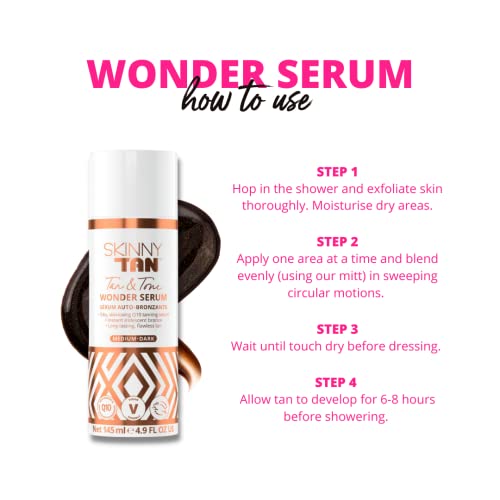- BEAUTY PRODUCTS: Wonder Serum Self Tan develops within 6-8 hours & then rinse - explore the Skinny Tan range for the perfect bronzer, body & face fake tan