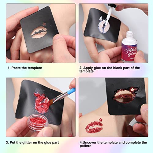 • The temporary flash glitter tattoo is easy enough for children to play with. Stick tattoo stencil and apply glue, brush on the glitter after the glue becomes transparent, then tear off stencil
