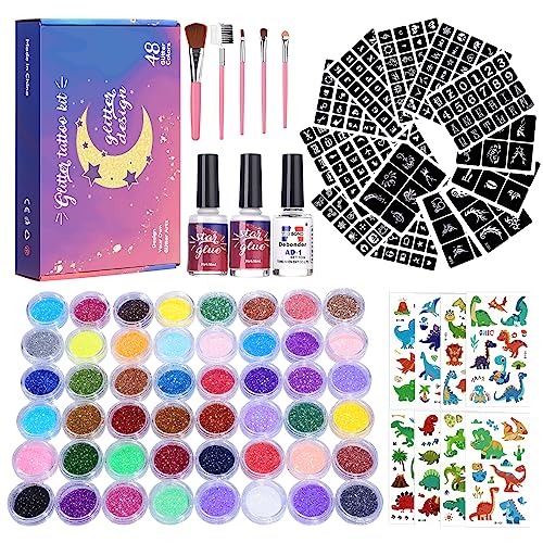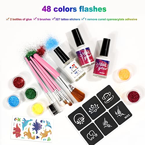 • Glitter tattoo kit for kids includes 48 colours of flash glitter, 318 stencils, 2 glues, 1Tattoo Remover,5 brushes and 10 Sheets Tattoo Stickers. The Temporary Glitter Tattoos set helps girls, boys shine all over the party with the unique sparkling body art
