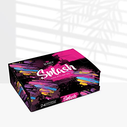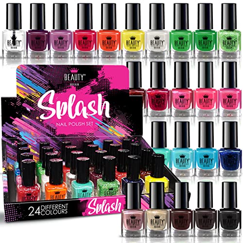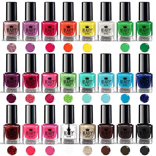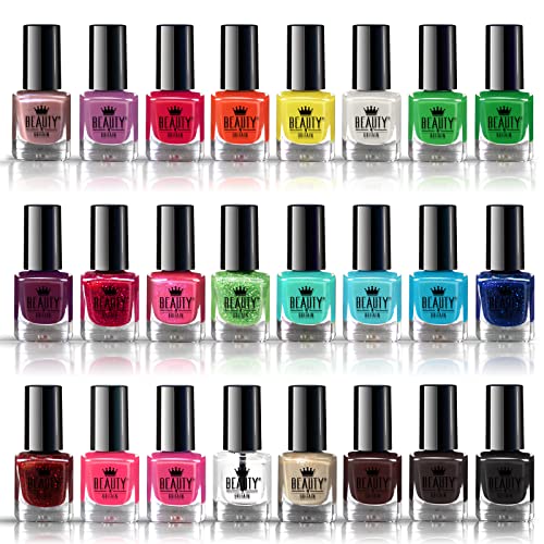 - Set of 24 Different Classic, Bright, Pearl and Glitter Colours. The set includes white and top coat.