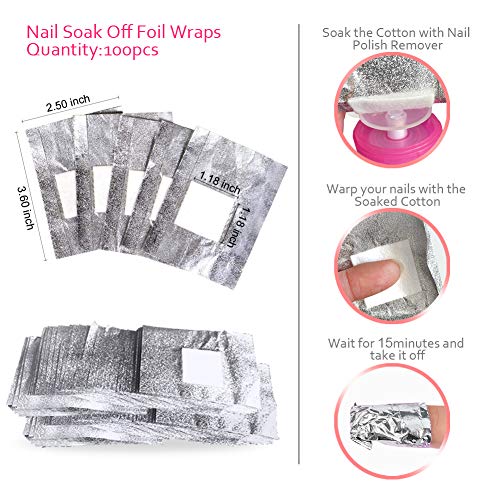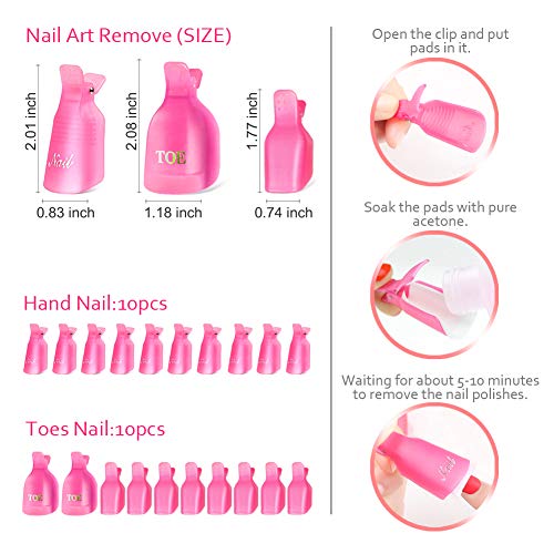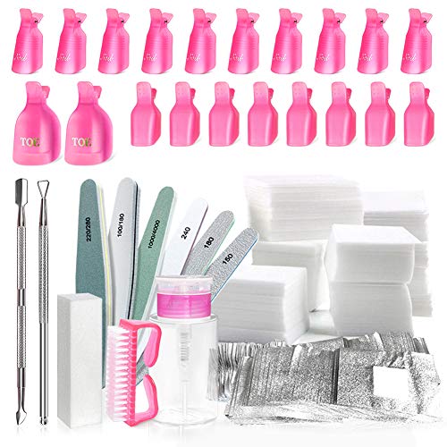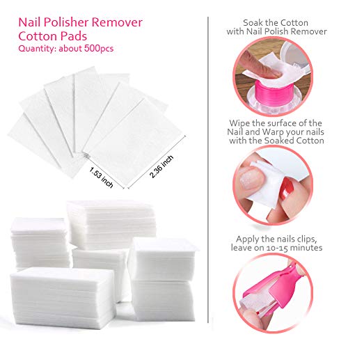 • Valuable Nail Polish Polish Remover Tools Kit: Package comes with 20 x gel polish remover clips, 500 x lint free nail Cotton Pads + 100 Nail Soak Off Foil Wraps , 1 x acetone pump dispenser, 2pcs cuticle tools set, 1pcs buffer block, 6 x nail files, 1x nail brushes. Great for gel polish soak off remover