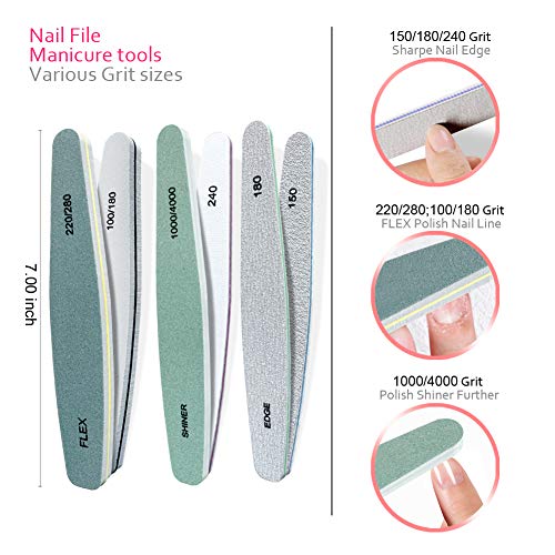 • Nail File Buffer & Nail Shiner: reusable and with different grit sides. nail file buffer 150/180/240 can help remove nail gel and trim your nail to desired length and shape, suitable for natural or fake nails;nail shiner with 220/280 ; 100/180 grit,to polish your nails and remove the line one the surface of the nail, you can use green side to refine nail surface ; nail shiner 1000/4000 white side is 1000 grit, the best helper for you to smooth nail surface and 4000 grit polish and shine it.