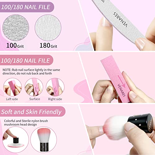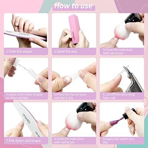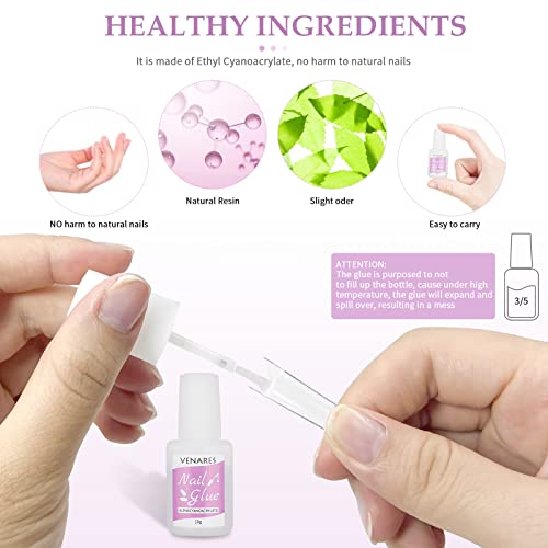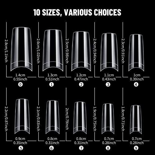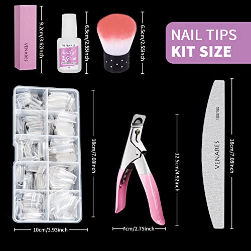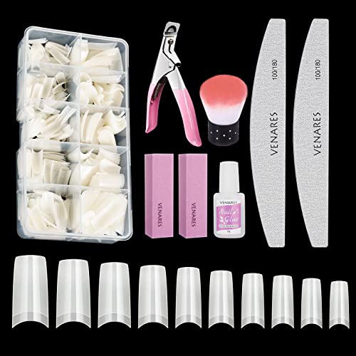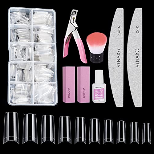 - All in one half nail tips square: 500pcs clear square nail tips in 10 different sizes fit most fingers. 1pcs Venares brush-on nail glue (10g), 1pc acylic nail clipper, 2pcs 100/180 grits nail files, 2pc nail buffer blocks and 1 pcs acrylic nail brush.
