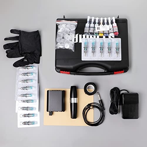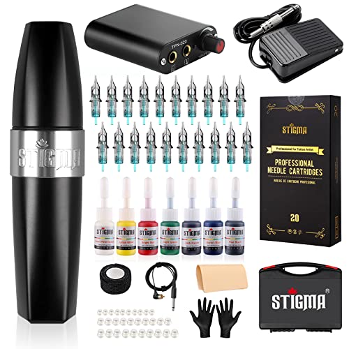 - ✶PACKAGE INCLUDING: Stigma Tattoo pen machine kit include a tattoo pen, a power supply, a pedal, 20pcs tattoo cartridge needles, 30pcs ink cups, a tattoo tape, a practice skin, 7 colors tattoo ink and a pair of gloves with a plastic box. After receiving our kit, please check whether the above accessories are missing.