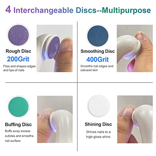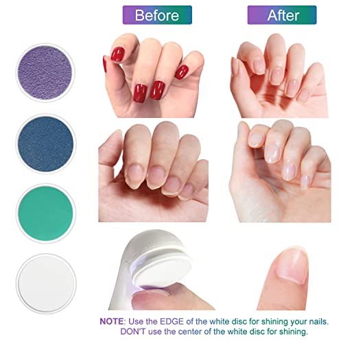 - 【4-in-1 Tool Let You Get Salon Quality Manicures & Pedicures at home】 This professional nail file and buffer set comes with 4 Discs for Shaping, Smoothing, Buffing & Shining. The rough purple disc can be used for shaping your nails and removing nail polish & cuticle . The blue disc can be used for smoothing your nails. The green disc can be used for buffing and removing nail debris. The white disc is used for shining your nails. Suitable for thick gel, natural and acrylic nails.