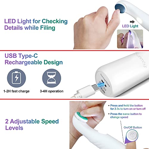 - 【Cordless, Rechargeable & 2 Speed Levels】This nail and buffer set is rechargeable and designed with 2 speed levels. The Low Speed is used for gentle grooming of cuticles & nail surface. The high Speed is used for quicker shaping & buffing. So you can choose the speed level as needed. This nail file set not only saves your time, but also gently buffs away the look of ridges and uneven nails.