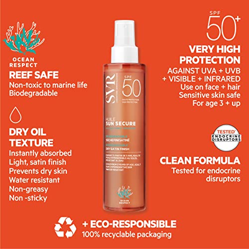 SVR SUN SECURE SPF50+ Body Dry Oil for Hypersensitive Skin, Very High UVA/UVB, IR Protection, Dry Satin Finish, Water-Resistant, Biodegradable, R