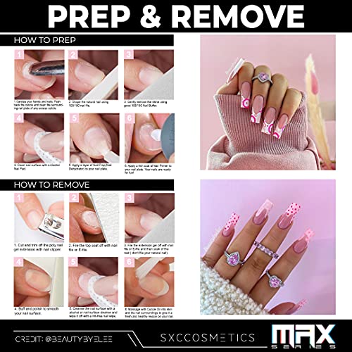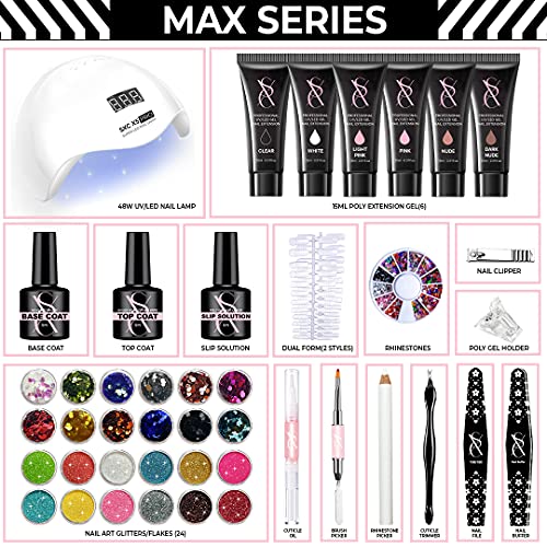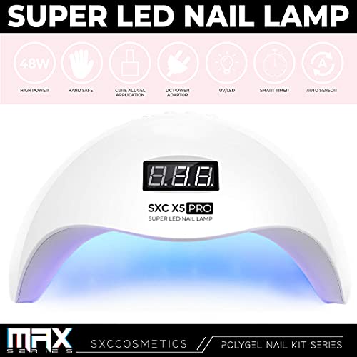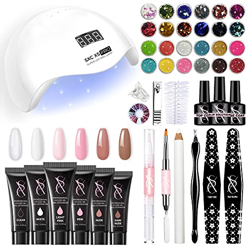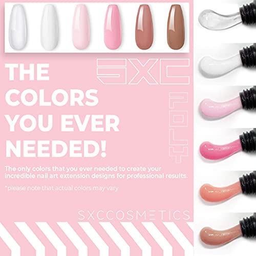 - 🔥POLYGEL NAIL KIT MAX SERIES - SXC Cosmetics All-in-One Polygel Nail kit comes with 6 tubes of Clear, White, Pink & Nude Poly Extension Nail Gel. An Incredible 48W Professional UV LED Nail Lamp, Glossy Top Coat and Base Coat, Gel Base Slip Solution, and many other more amazing tools to help to get your nail extension done in a quick and easy fashion.
