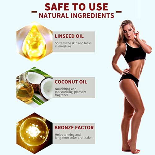 - 【Natural plant ingredients】This tanning season, we’ve perfected the tanning oil formula for the perfect rich dark glow by adding COCONUT OIL (Nourishing and moisturizing your skin, pleasant fragrance), BRONZE FACTOR (Helps tanning and long-term color protection) and LINSEED OIL (Softens the skin and locks in moisture).