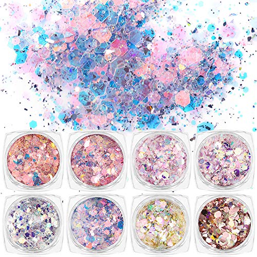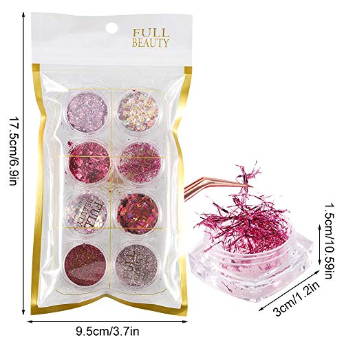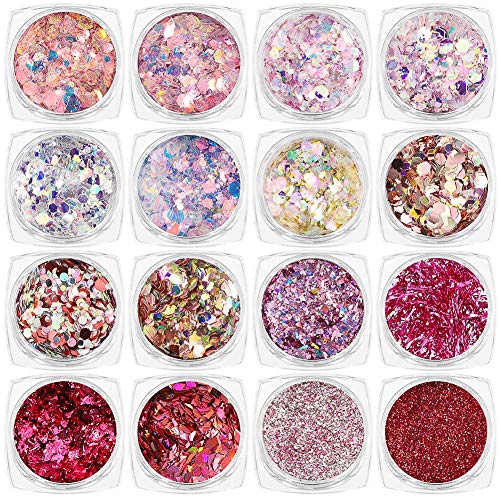 - ★Package Includes: 16 Different design nail art glitters come with 16 boxes with separate storage space, fashionable, shinning and iridescent flakes