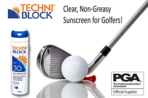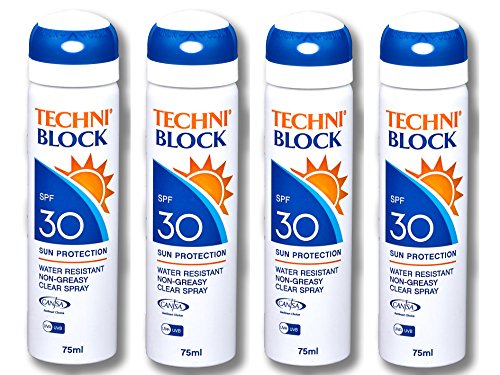 - Save £10 when you buy this multi-pack of 4 x SPF 30 75mls. Techniblock is a non-greasy, non-sticky, cooling spray that leaves little presence on the skin and provides long lasting, broad spectrum (UVA and UVB) protection. Delivered in a continuous clear spray that works upside down and provides effortless and simple all over application - even the scalp!