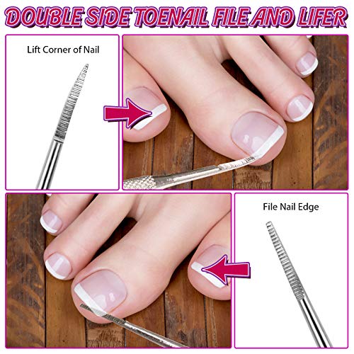 - 2pcs Cuticle Shaped Kit - 1pcs cuticle pusher + 1pcs nail lifter & file: Cuticle pusher have 2 heads, sharp scraper side can scrape away dead cuticle, clean nail dirt and remove nail art decoration, flat spoon side always be used to remove soak off gel nails, help push the cuticle and shape it; Toenail lifter & file come with straight and curved end, both of them can file inner surface and round out nail edge, you can use curved end to lift corner of nails to remove the buildup