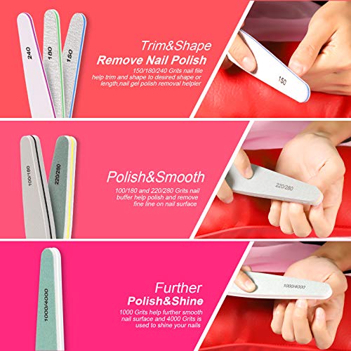 - 3 Steps to Make Personal Nail Style - 150/180/240 Grit Cushioned Board(Blue/Green/Purple Files) with super rough emery board, can help quick trim your nails to proper length, shape nails and also remove nail polish; 100/180, 220/280 Grit(Black/Yellow Files) should be your first nail shiner step tool, not super rough and always refines scratches on nail surface, smooth and lightly polish nails surface; 1000/4000 Grit(White Buffer) can further smooth nail surface then polish it and make it shine