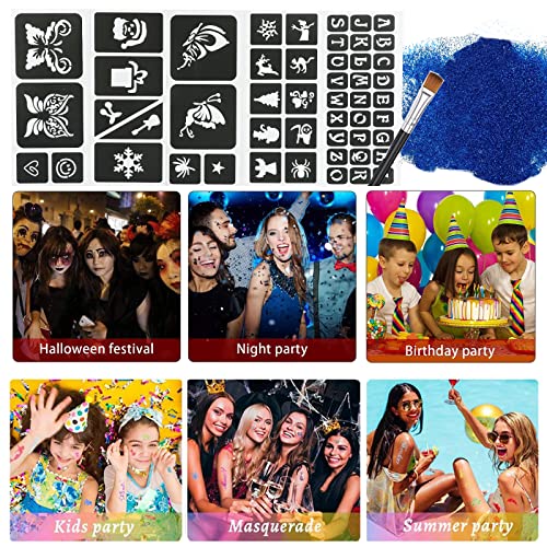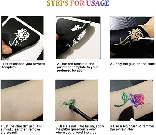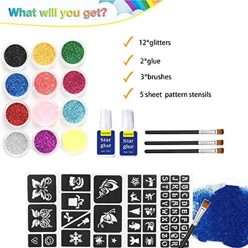 • Cute and Fun Tattoo Designs!Includes 12 color glitters, 49 glitter tattoo stencils, 3 Brushes, 2 bottle tattoo glue. You can easy create a unique body art glitter temporary tattoo!