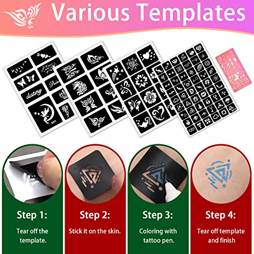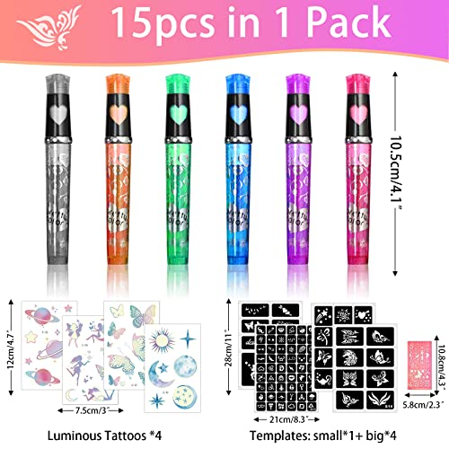 - 【TATTOO PEN KIT】You will receive 6pcs tattoo marker pen, 4 sheets luminous tattoos sticker and 5 sheets stencils (4 big + 1 small size). Our tattoo marker kit is a wonderful gift for children.