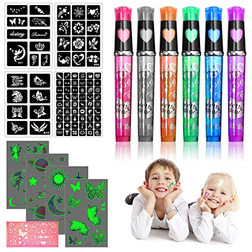- 【6 GLITTER COLOURS】There are 6 different glitter colours for tattoo pen: silver, purple, blue, green, orange and rose red. Kids can create colourful and vibrant temporary tattoos to decorate themself!