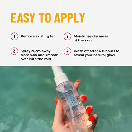 - EASY TO APPLY: On the go tanning made easy, spray the water straight onto your skin approximately 20cm away and use our luxury tanning mitt to smooth into the skin. Ensure no patch is left without a glow
