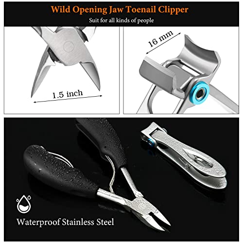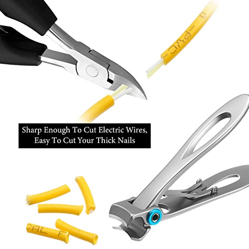 - Wide jaw opening nail clipper: this practical nail clipper is designed with 180 degree wide jaw opening for thick nails up to 16 mm, which can make it easier to trim extra thick fingernails and toenails; The non-slip handle also provides you extra strength when pressing down on thick nails, saving you effort and use conveniently