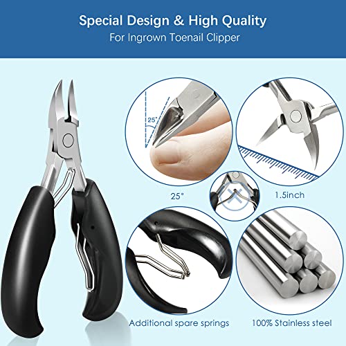 - ✅Toenail Clippers for Thick&Ingrown Nails - Nail Clippers 25° curve fit toe nail design, 40 mm/1.57 inch extra wide jaw opening, force saving spring design (extra spare spring), updated alloy stainless steel material and ergonomic handle for easy and precise cutting of inward growing nails or sharp pieces in corners without hurting yourself, easy to keep away from nail ingrown troubles.