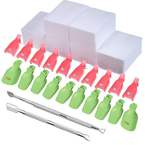 - NAIL REMOVER CLIP SET: Includes 10 pieces nail soak off cap clips for fingers and 10 pieces for toes with 500 pieces nail wipe cotton pads and 2 stainless steel double end cuticle pusher cutter spoon shovel. Four different styles for you to choose from.