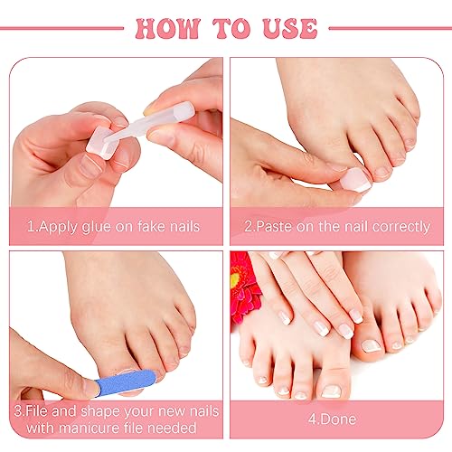 - ❤ Ease to use: 1.Use the nail file to polish the toenail surface. 2.Clean your toenails and confirm them are dry.3. Choose the right size glue sticker and stick it on your toenails.4.Stick the suitable false toenail and press it for 10 seconds until it sticks firmly.5.Trim the edges with a nail file.