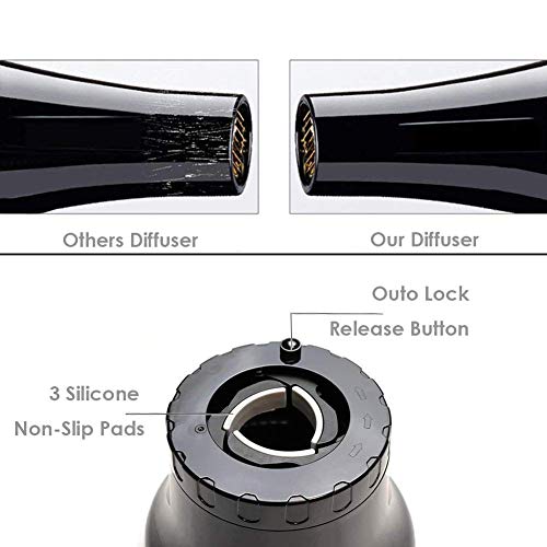 - 【Universal application】 : This universal diffuser features a new rotary design with locking button, is adjustable and fits for hair dryers with a nozzle diameter of 1.4 inch, 2.6 inch. It can adapt to more than 99% different designs of hair dryers on the market and is easy to use.